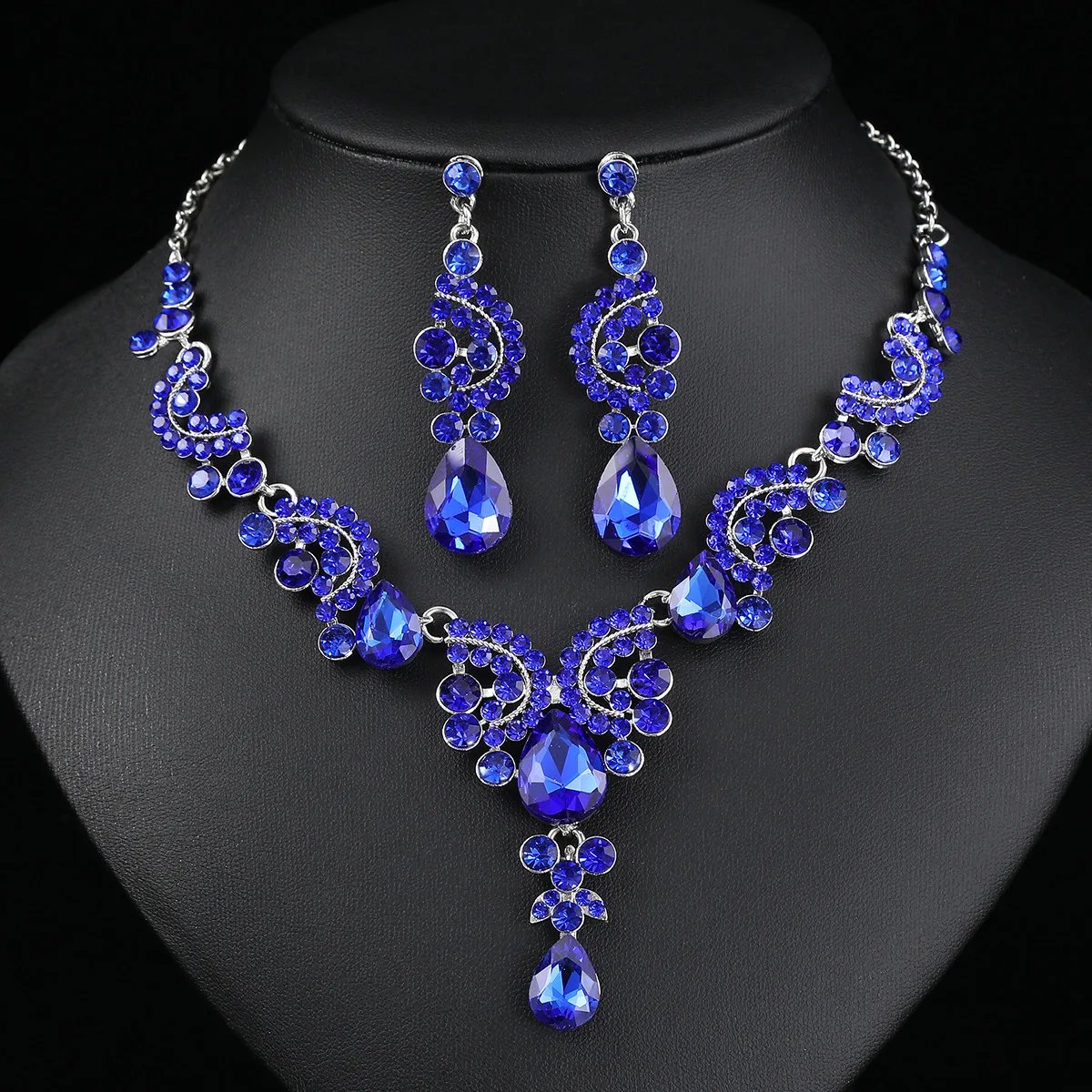 2 pièces/ensemble ensembles de bijoux femmes bleu élégant goutte d’eau strass pendentif collier boucles d’oreilles robe de mariée ensemble de bijoux de mariée